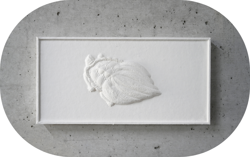 かつて和菓子を形づくった木型をもとに、手漉き和紙で仕上げたレリーフ作品。